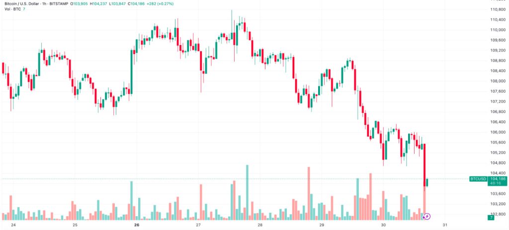 Donald Trump’ın Çin’in ticaret anlaşmalarını ihlal ettiğini iddia etmesiyle BTC fiyatı bir saat içinde neredeyse 2.000 dolar kaybetti. Fiyat, son birkaç saat içinde yaklaşık 103.700 dolar seviyesine kadar geriledi.