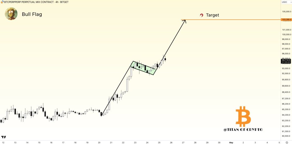 Analist Titan of Crypto, X hesabından yaptığı paylaşımda bir boğa bayrağı kırılımının devam ettiğini iddia etti ve 103 bin dolar seviyesine kısa vadeli bir hareket öngörerek yükseliş eğilimini ateşledi.