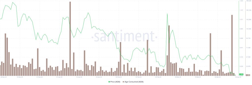 Öte yandan, belirli bir tarihte el değiştiren token adedini ve en son ne zaman taşındığını dikkate alan Santiment’in Tüketilen Yaş Endeksi (Age Consumed), Cardano için düşüş yönlü bir görünüm öngörüyor.
