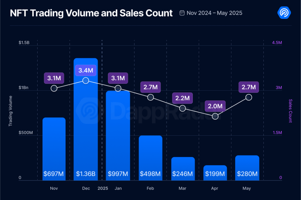DappRadar’ın son bulguları Mayıs 2025’i dapp sektörü için bir dönüm noktası olarak tanımlıyor. Aynı dönemde NFT piyasasında da yaşam belirtileri görüldü.