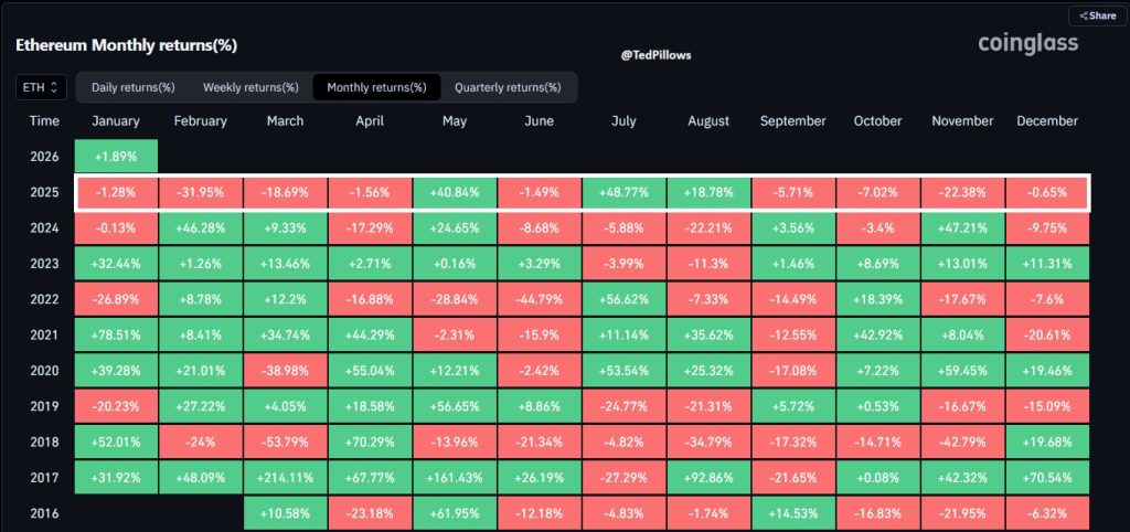 Piyasa yorumcusu Ted Pillows tarafından paylaşılan CoinGlass verileri, 2025 yılında ETH’nin Şubat’tan Nisan’a ve Eylül’den Aralık’a kadar her ay düşüş yaşadığını gösteriyor. En şiddetli aylık düşüş Şubat ayında yaşandı ve varlık yüzde 32 oranında değer kaybı yaşadı. Diğer önemli aylık düşüşler arasında Kasım ayında yüzde 22 ve Mart ayında yüzde 18,7’lik düşüşler yer aldı.