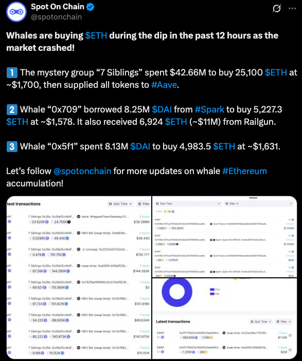 Zincir üstü kripto analiz platformu Spot On Chain tarafından paylaşılan veriler, “7 Siblings” olarak bilinen gizemli grubun bu işi üstlendiğini gösteriyor. Ortalama 1.700 dolardan 25.100 ETH satın almak için 42.66 milyon dolar gibi yüklü bir harcama yapan grup daha sonra muhtemelen getiri elde etmek veya varlıklar karşılığında borçlanabilmek amacıyla tüm tutarı hızla Aave borç verme platformuna yatırdı.