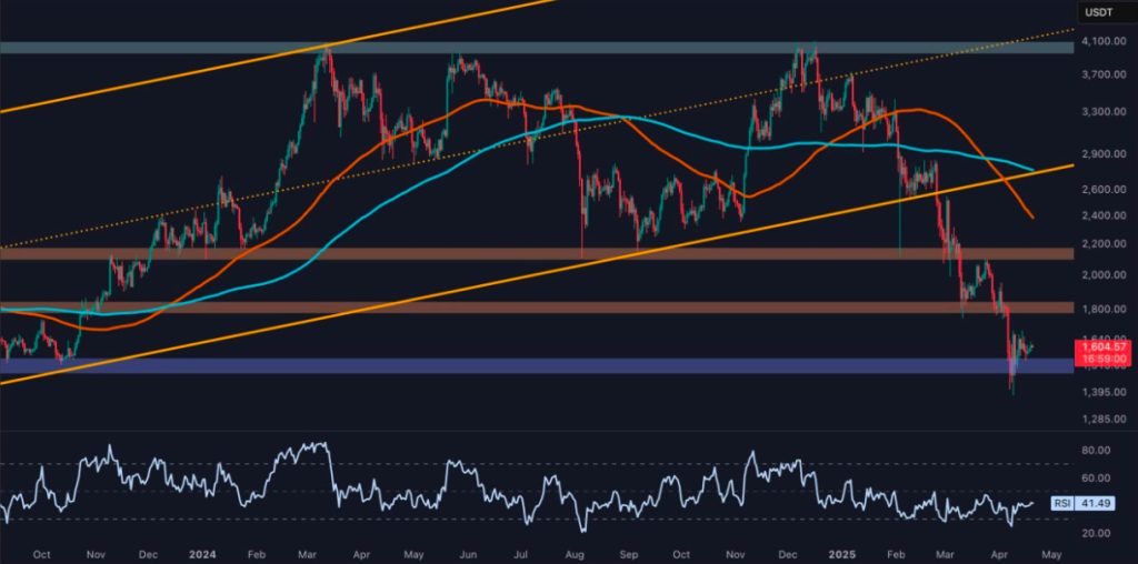 4 saatlik zaman dilimine bakıldığında, Ethereum’un dar aralıktaki konsolidasyonu açıkça görülüyor. Fiyat şu anda 1,5 bin dolarlık destek ile alçalan kanalın üst sınırı olan 1,6 bin dolar arasında sıkışmış durumda ve bu tablo dengedeki bir piyasayı yansıtıyor. Bu denge hem alıcıların hem de satıcıların tereddüt ettiğini gösteriyor.