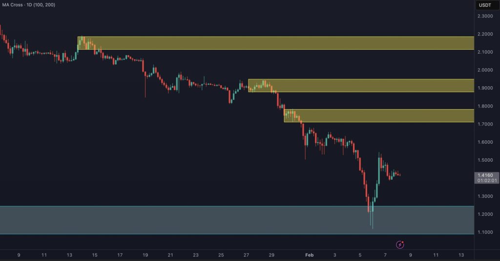 4 saatlik zaman dilimine yakından bakıldığında, satıcıların akını daha belirgin hale geliyor ve fiyat agresif bir şekilde 1 dolar eşiğine ulaşıyor. Ancak, en son ani düşüşün ardından düzeltici bir sıçrama yaşandı ve bu da varlığı 1,5 dolar civarındaki iç arz bölgesine itti.
