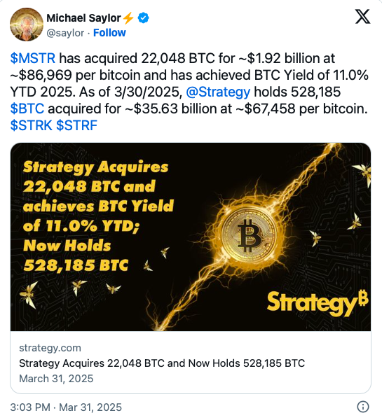 Şirketin kurucu ortağı Michael Saylor, son duyurusunda şirketin 22.048 BTC satın almak için yaklaşık 2 milyar dolar harcadığını söyledi.